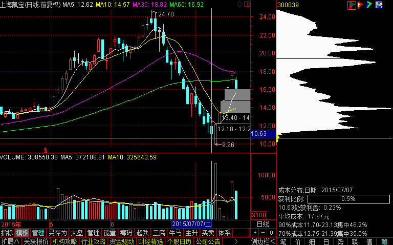 上海凯宝股价剧烈下跌,但原密集峰并未消耗,则股价反转阻力位,在上方密集峰的下沿,也就是图中反转高点的位置。