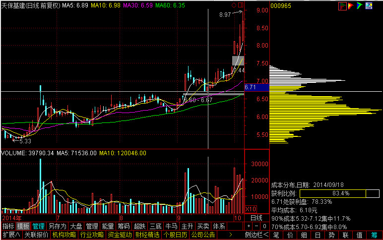 天保基建形成密集峰后,股价放量突破密集峰,回踩成功站稳密集峰上沿,开始继续上攻。