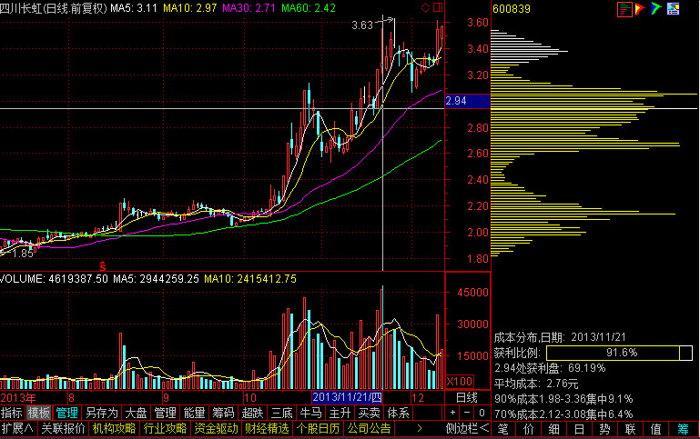 四川长虹上攻过程中,低位的密集峰始终没有消失,则股价持续看涨。