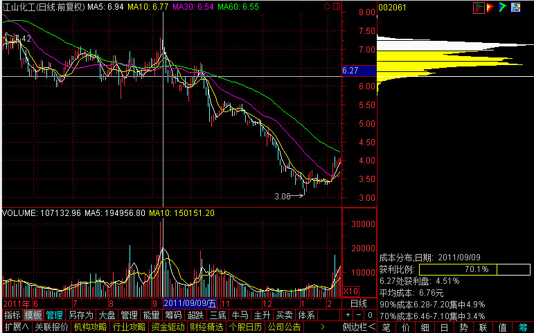 江山化工前期形成高位单峰密集后,股价向下突破,此时必须做止损动作。