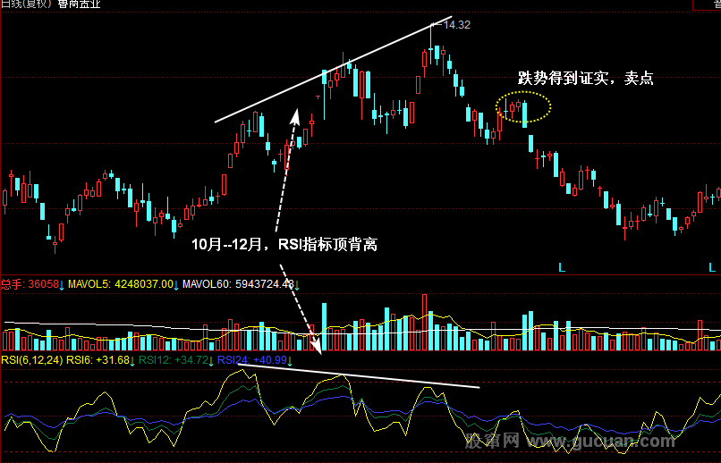 如图显示,2009年10月至12月,鲁商置业(600223)股价震上涨的同时。RSI指标却不断下跌。二者形成了顶部背离形态。这个形态说明上涨行情动力不足,是股价将见顶下跌的信号。