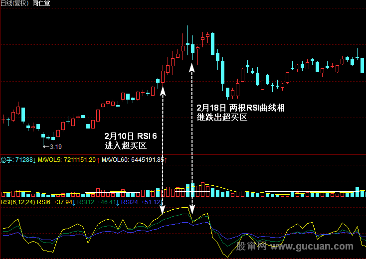 在很多炒股软件中,都有三根不同周期的RSI曲线,默认周期分别为6日、12日和24日。