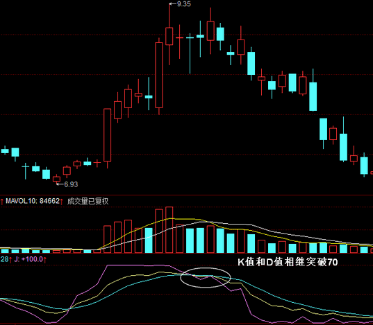 由于指标线K要比指标线D的敏感性更高,所以一般情况下都是指标线K先进入30以下的超卖状态,随后指标线D才进入。由于指标线D的可靠性更高,所以谨慎的投资者可以按照指标线D的看涨信号操作。kdj指标详解:K值或D值给于70(KDJ超买区) 超买,是指 股价的上涨超过了买方的能力 ,意即股价的上涨幅度达到了某个不合理的区域,股价随时可能见顶回落,是一种看跌信号。 当K值或者D值进入70以上的区域时,就意味着股价进入了超买状态,说明股价的持续上涨已经消耗了多方的多半力量,而获利盘的不断增加则壮大了空方力量。一旦多方不能再将股价维持在高位,那么股价的下跌行情就要开始了。如下图所示