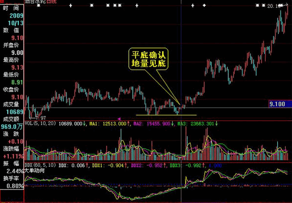 如下的例子是烟台冰轮在2009年8月至9月的调整中,连续三次在8.5元附近获得支撑,形成中线震荡的箱体。说明向下直接杀跌的动能已经不足。成交量的地量水平说明极少的买盘成交量就封闭了下跌空间。后市在买方资金进场的推动下,股价连续强势。特别是DDX三线上穿0轴后连续多头运行。则阶段地量见底出现后就形成了中线强势波段。