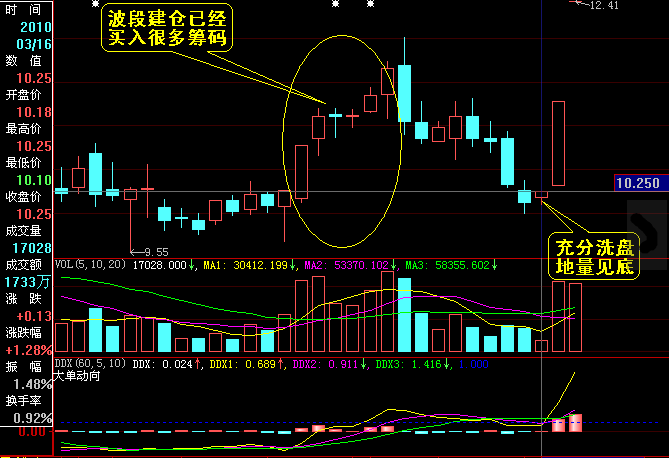 上面两种情形都是中线地量见底的情形。而短线的地量往往则难以判断,特别是下跌中的地量,往往更难以判断是否见底。但有一种情形确实比较确定的,那就是连续波段建仓之后的连续洗盘。在确认波段洗盘之前,首先要确认两点:一是要注意建仓波段的位置与加权成本和最低成本;二是要注意建仓波段要明显放量,而洗盘波段则相对缩量。