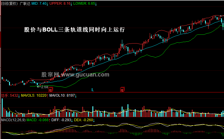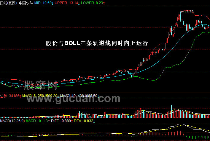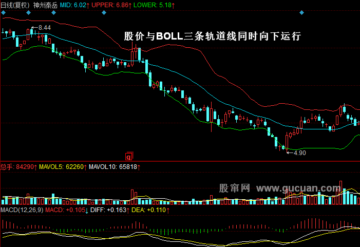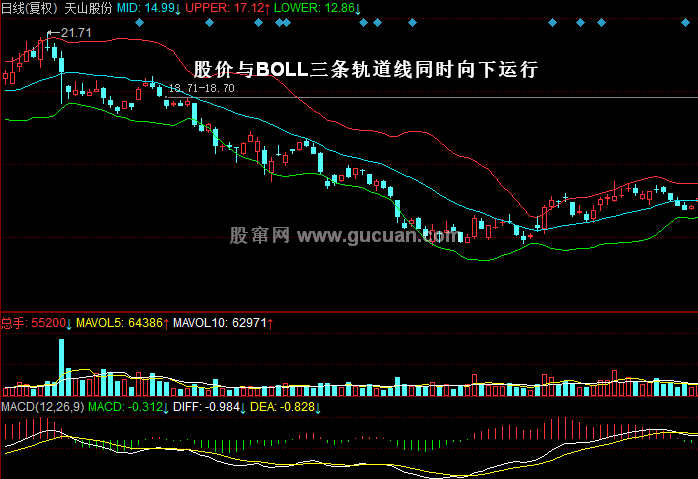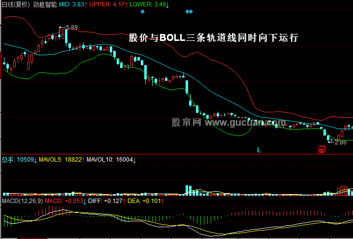 2.当BOLL的上轨线、中轨线和下轨线同时向下运行时,表明股价的弱势特征非常明显,股价短期内将继续下跌,投资者应持币观望或逢高卖出。