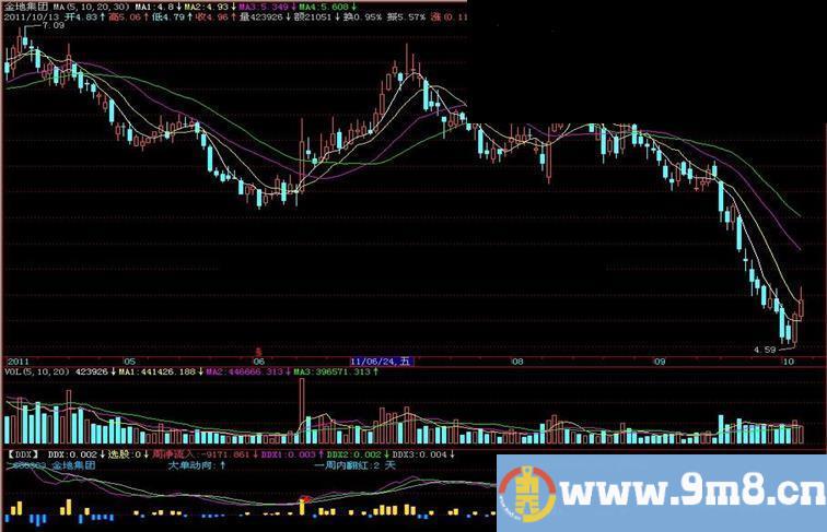 DRAWTEXTEX(DD<0,1,200,0,'大单动向:'+'↓'),colorFFDD00;