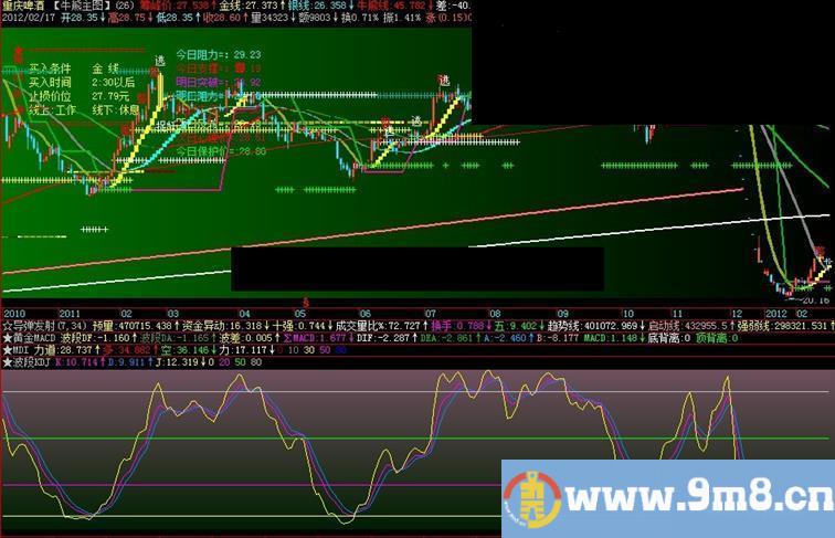 用法说明:重点关注J值配合主图用来逃顶抄底,当J值在五日内小于0后,主图中如果股价上穿底线同时J值拐头向上就是抄底时机;当J值下穿80,股价下穿金线就是逃顶时机,50为强弱分界线。