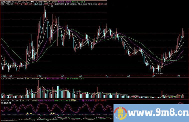 预警:DDX>0 AND CROSS(DDX1,DDX2) AND (CLOSE/REF(CLOSE,1)-1)*100>=3,LINETHICK0;