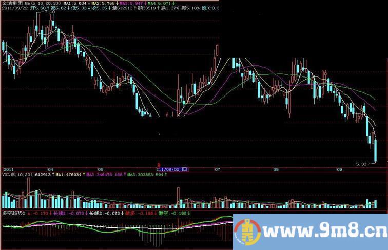 使用方法:当长线拐头向上,多空线上穿长线,即四条线从粘合向上呈分散状时介入,介入后做多线(红线)消失,卖出。