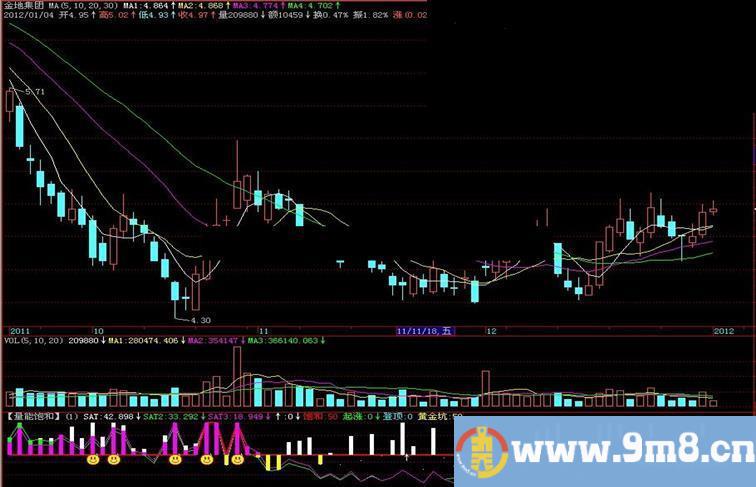 黄金坑:IF(COUNT(NOT(饱和=50),10) AND SAT<50,SAT,50),COLOR00FFFF,POINTDOT,LINETHICK0;