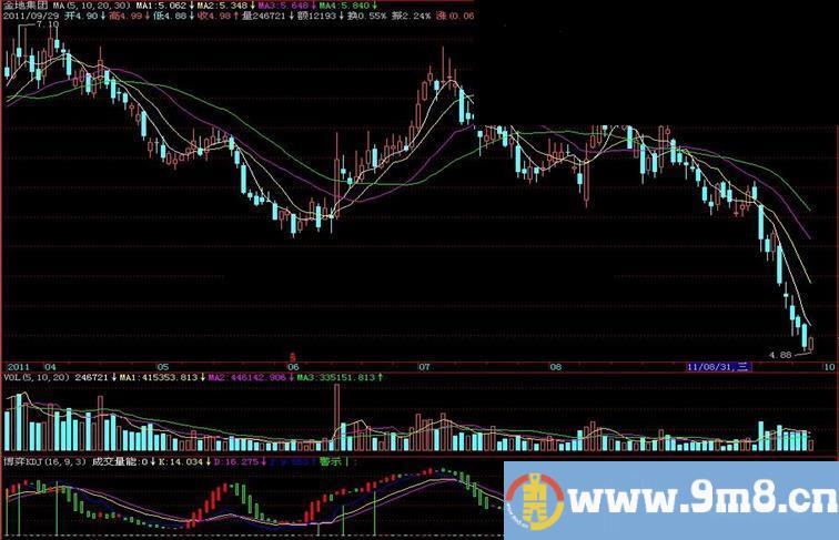 "VOL"调整成交量能图形(高度)与KDJ线的匹配状态。