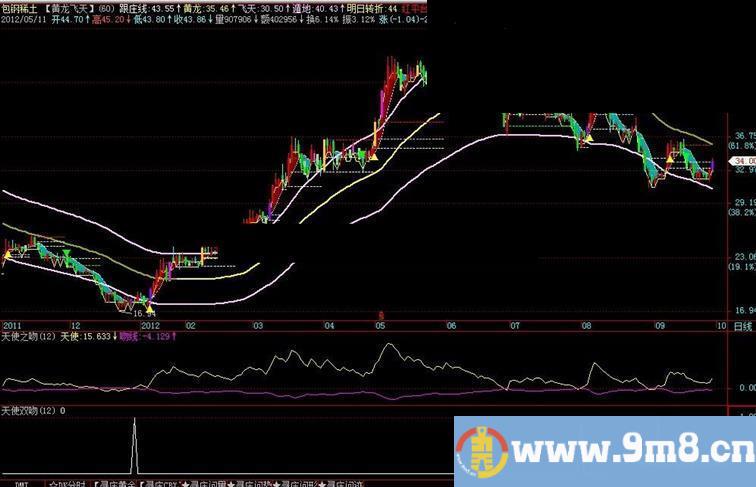 本指标是在对天使之吻进行了改动后所作,所谓天使双吻是指副图为一吻,主图中的转折线与遁地线为二吻,出现双吻后,天使线上穿吻线作为抄底条件。