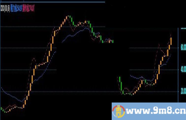 阻力线:EMA((CLOSE-zyVAR2)/(zyVAR1-zyVAR2)*100,20),ColorFF8000,LINETHICK1,PRECISION1,LINEDOT;