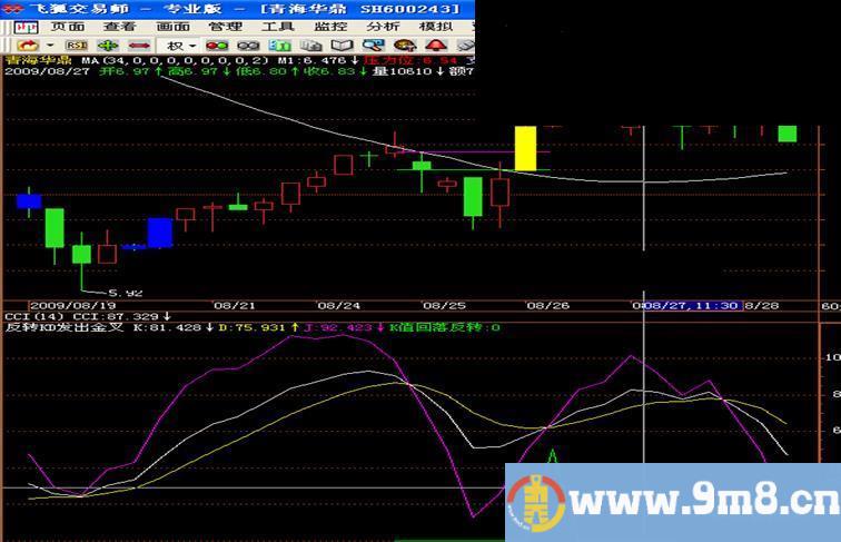 后k值回落下穿80至50,且大于50.后反转kd发出金叉。