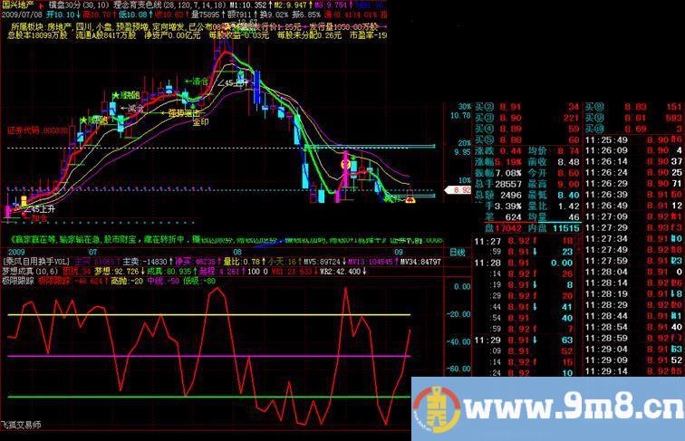 LOCK:=IF(CURRENTDATE<1381130,1,0); 极限跟踪:-100*(HHV(HIGH,5)-CLOSE)/(HHV(HIGH,5)-LLV(LOW,5)),LINETHICK2,colorFF; 高抛:-20,LINETHICK2,colorFFFF; 中线:-50,LINETHICK2,colorFF00FF; 低吸:-80,LINETHICK2,colorFF00;