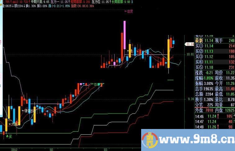 在中国资本市场要想实现持续盈利难上加难,一切技术都离不开趋势为基础----否则都是浮云 毒草。本人也是经历了非常痛苦的过程。到处加炒股群,学什么追涨停板技术等等。都是急功近利亏损累累。此指标建立在趋势为基础上的操作。我用它也赚了点钱,持续盈利要严格遵守操作提示。纪律要严格遵守。波段操作一目了然, 依托两根红色线和一根浅蓝色线为趋势基础,绝不要违背这三条趋势线操作。宁可失去机会,绝不失去本金。休息也是投资的一部分。