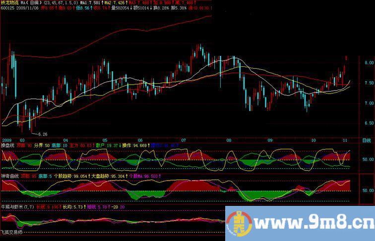 操作:SMA(((主力-LLV(主力,6))/(HHV(主力,6)-LLV(主力,6))*100),2,1),COLORYELLOW;