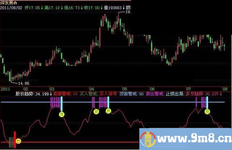 卖出警戒:STICKLINE(股价趋势>=85,100,80,2,0),STICK,colorF00FF0,linethick2;