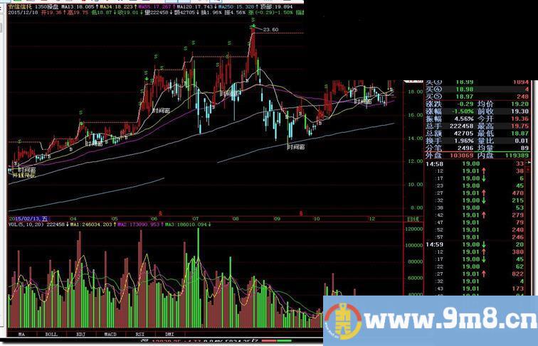 顶部: HHV(HIGH,60)*0.98,colorFFFFCC; STICKLINE(顶部=REF(顶部,1),顶部,顶部,7,1),colorred; TJTS:=BARSTATUS=2; cg:=hhv(h,125); cgl:=llv(h,125); j:=(cg-cgl)/8; {IF C>0 AND TJTS>0 THEN BEGIN} {DRAWTEXT(C>0,cg*1.04,' '+ '流通:'+NUMTOSTRN( FINANCE(7),0 )+' '+'换手:'+NUMTOSTRN( DYNAINFO(37)*100,3 )+' '),LINETHICK3,ColorFFFF80,ALIGN2;end;} zslife:=(ma(indexc,60)+ma(indexc,90))/2; zsbl:=indexc/zslife; gglife:=(ma(c,60)+ma(c,90))/2; zstb:=zsbl*gglife; rsv:=(c-llv(l,15))/(hhv(h,15)-llv(l,15))*100; kk:=sma(rsv,10,1); dd:=sma(kk,5,1); zlcm:=intpart(sma(rsv,10,1)); shcm:=intpart(sma(kk,5,1)); {IF (zlcm+shcm)>50 and (zlcm+shcm)<160 AND TJTS THEN DRAWTEXT(C>0,cg-1.1*j,'精确风险系数%:'+NUMTOSTRN( (zlcm+shcm),2 )+' '),LINETHICK3,color6699cc,ALIGN2;} {IF ((zlcm+shcm)<=50 or (zlcm+shcm)>=160) AND TJTS THEN DRAWTEXT(C>0,cg-1.1*j,'精确风险系数%:'+NUMTOSTRN( -(zlcm+shcm),2 )+' '),LINETHICK3,color6699cc,ALIGN2;} aa13:=ma(winner(c)*70,3); bb13:=ma((winner(c*1.1)-winner(c*0.9))*80,3); { IF aa13>bb13 AND TJTS THEN DRAWTEXT(C>0,cg-2.1*j,'主力控盘系数%:'+NUMTOSTRN( aa13/(aa13+bb13)*100,2 )+' '),LINETHICK3,color0000ff,ALIGN2; IF aa13 } e:=BARSCOUNT(c); ah:=hhv(h,250); al:=llv(l,250); b0:=(ah-al)/40; kb1:=h+b0; kb2:=l-b0; stickline((e+0)/34=FLOOR((e+0)/34),kb2,kb2-3*b0,2,0),COLORYELLOW; drawtext((e+0)/34=FLOOR((e+0)/34),kb2-2*b0,'时间窗'),COLORFFFFFF; V1:=REF(C,1); V2:=SMA(MAX(C-V1,0),6,1)/SMA(ABS(C-V1),6,1)*100; DRAWICON(IF(CROSS(81,V2),1,0),h*1.01,5),COLORYELLOW; 乖离线:=((c-ref(ma13,1))/13+ma13)*1.20; tt1:=cross(ma13,ma34) and cross(ma13,ma55) and v>ref(v,1); tt2:=ma13>ref(ma13,2) and v>ref(v,1) and cross(c,ma13); STICKLINE(TT1,l,l-0.09,4,0),coloryellow; DRAWTEXT(TT1,l-0.13,'金叉'),coloryellow; STICKLINE(cross(c,ma34) and cross(c,ma55) and cross(c,ma13),l,l-0.09,4,0),coloryellow; DRAWTEXT(cross(c,ma34) and cross(c,ma55) and cross(c,ma13),l-0.13,'并线开花'),coloryellow;