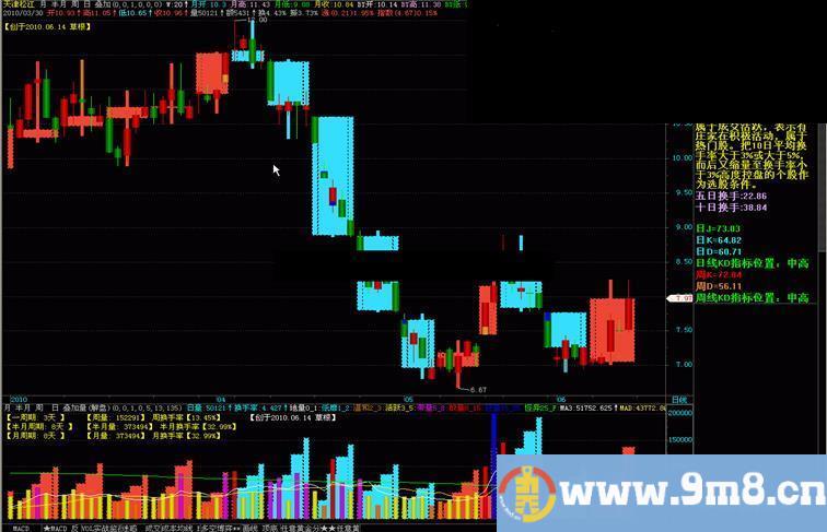 Explain(换手率>=8 and 换手率<15,'日换手率大于8%--15%,股价属于成交放量。'),color0022ff;