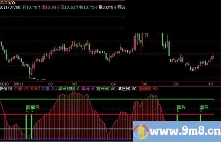 黑马初现:IF(CROSS(个股,9),50,0),STICK,LINETHICK3,COLOR00FF00;