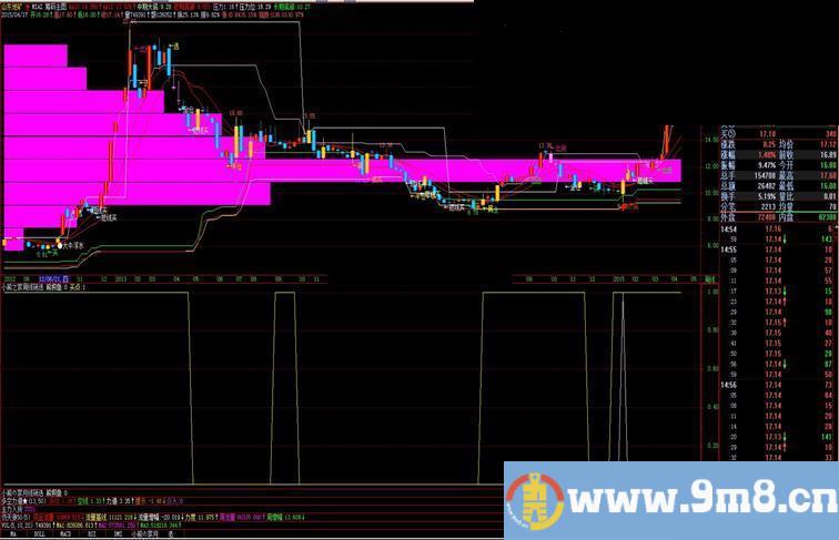 此指标很直观的把筹码直接呈现在主图上,一般选择较长一段时间才能分析筹码在此价位之上还是此价位之下的多少。 如果选择的股票处于低位,筹码属于不高于股价位置或与股价位置出现单峰。可以考虑买入做中长线的投资。 图中显示的小熊之家周线筛选指标就是自制的中长线买入指标,结合本主图确实用处也提升了。 多多给我加分,小熊之家周线筛选副图指标会在不久将来也可以在贴中下载到。谢谢各位