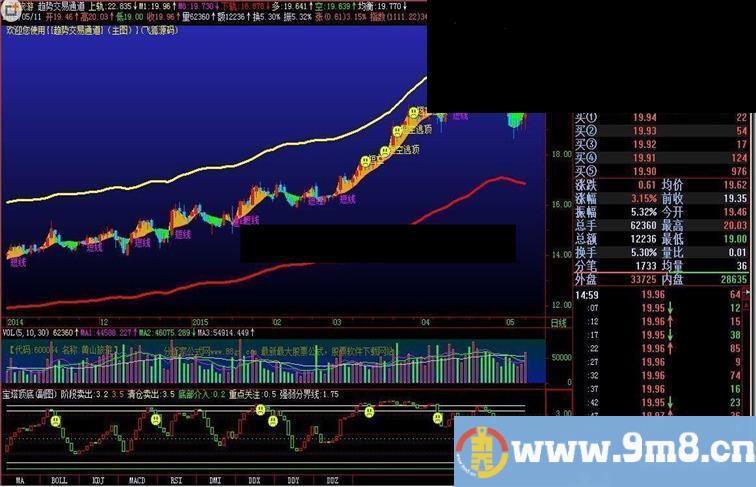 上轨:SMA(AMOUNT/VOL/100,13,1)*1.15,COLORYELLOW,linethick3;