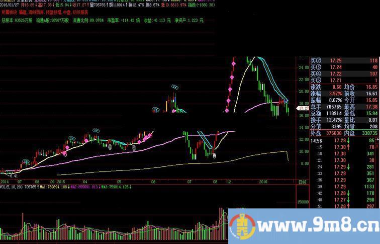 持股线:IF(MA(CLOSE,17) PARTLINE(持股线=MA17,持股线),color80ffff,linethick2; {www.9m8.cn} STICKLINE(c>=ref(c,1),o,c,8,1),color000000; STICKLINE(c