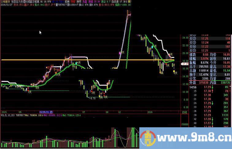 反转:画柱线(Var9>1*向前引用(Var9, 1), 最高价,最低价,0.5,0), COLORwhite;