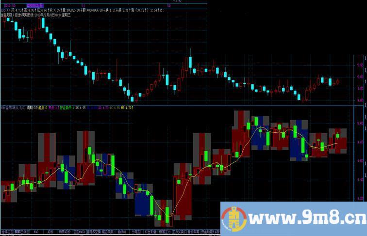 简单说明: 涨跌幅在百分之M的N日K线合并画法,调整参数 XK 可以设置合并K线的数量(建议设置为奇数,为偶数时所画K线可能会有点点偏差,因为确定中点向后错了一位,但高、低、开、收不错),调整M设置限制区间涨跌幅,小于区间涨跌幅的不画出,M设为0表示不设置限制涨跌幅,只按XK区间合并K线画出。(注:合并K线的画法是从上市起向后推移合并,故最后一组合并K线可能会有不足XK设置数的情况,但仍然按一组K线画出。遇到少于XK一半的,高低按简单画法画出)