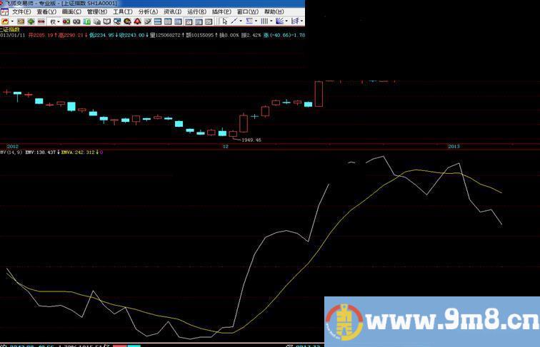 源码 input:p1(14,1,999,1),p2(9,1,999,1); A:=(H+L)/2; B:=(REF(H,1)+REF(L,1))/2; MID:=A-B; BRO:=VOL/(H-L); EMV:MA(MID/BRO,p1)*EMA(V,250); EMVA:MA(EMV,p2); 0,POINTDOT;