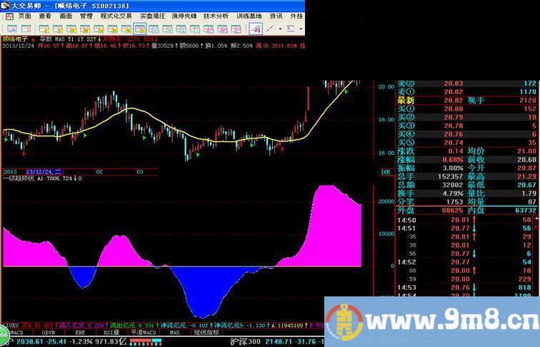 原用来做期指的单边行情所用,本人所编,现用来做股票,同样好用,主要根据量的原理,价格上涨为正量,价格下跌为负量,求和,然后平滑处理,此中量的处理,还是比较新颖少见的,希望能给你带来量的新的思路,0上的爬坡段为最安全的阶段,成功率高。公式没加密,指标高手可调节参数,希望能给大家带来好效益。