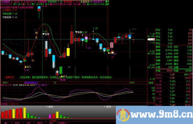 如图所示,该副图指标名为“大资金”,朋友给的,当大量出现彩色条状带后又出现“大资金”提示,配合其他提示买入指标,一般可以确定拉升。