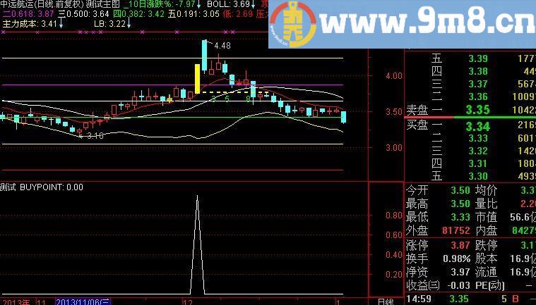 起爆:=REF(HHV(V,8),1)/V =1.97 AND REF(HHV(小阳,8),1) AND C