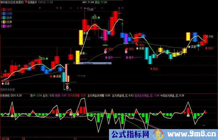 2.DDX是用柱体表示的;主力资金线是用黄色粗线表示的。另外,用文字表示了五日和十日的主力资金值。