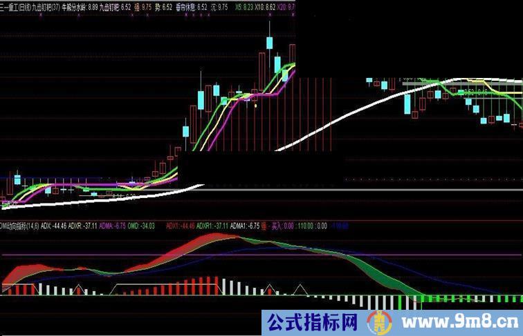N:=21;M:=6;M1:=20; TR1:=EMA(MAX(MAX(HIGH-LOW,ABS(HIGH-REF(CLOSE,1))),ABS(REF(CLOSE,1)-LOW)),N); HD :=HIGH-REF(HIGH,1); LD :=REF(LOW,1)-LOW; DMP:=EMA(IF(HD>0 AND HD>LD,HD,0),N); DMM:=EMA(IF(LD>0 AND LD>HD,LD,0),N); PDI:= DMP*100/TR1; MDI:= DMM*100/TR1; ADX: EMA((PDI-MDI)/(MDI+PDI)*100,M)*2; ADXR:EMA(ADX,M); ADMA:EMA(ADX,M1); OMD:(ADX-2*ADMA+ADXR)/2, COLORSTICK; DRAWBAND(ADX,RGB(155,50,50),ADXR,RGB(0,100,50)); STICKLINE(OMD>REF(OMD,1) AND OMD>0,0,OMD,1,0),COLORRED; STICKLINE(OMD>REF(OMD,1) AND OMD<0,0,OMD,1,0),COLORGREEN; STICKLINE(OMD=0 OR OMD<=0,0,0,50,1),COLORWHITE; ADX1:ADX,COLORRED; ADXR1:ADXR,COLORGREEN; ADMA1:ADMA; 强:IF(ADX1>=ADXR1,ADX1,DRAWNULL),COLORRED,LINETHICK3; 买入:IF(OMD>0 AND OMD-REF(OMD,1)>0,30,0); {OMD;} 110; 0; -110;