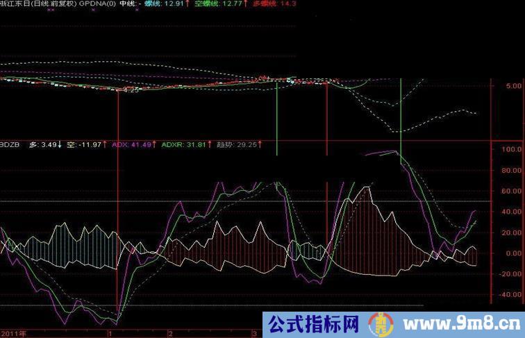 (4)当粉红线从高位(数值50以上)向下死叉绿线之后再死叉灰白虚线,股价趋势从上升转向下降;