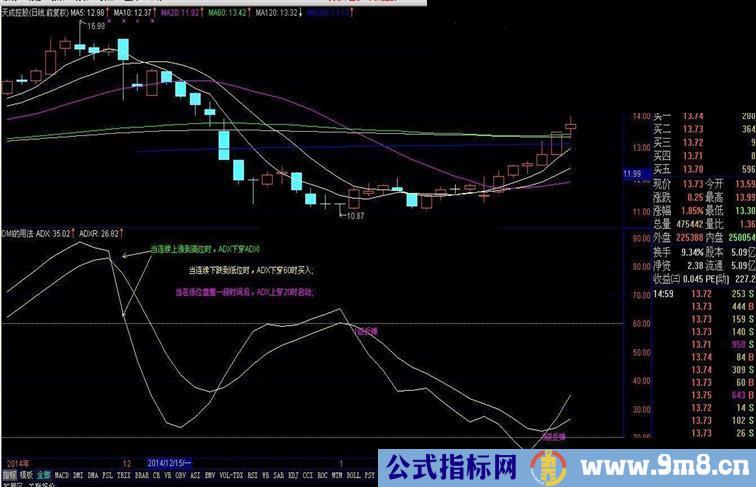 DRAWTEXT_FIX(1,0.5,0.21,1,'当在低位盘整一段时间后,ADX上穿20时启动;'),COLORMAGENTA;