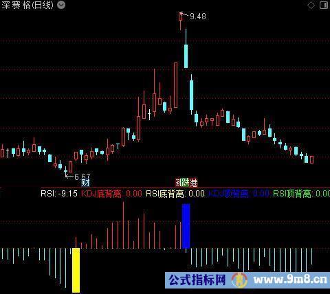 RSI顶背离:IF(GD3>0,0.1,0),COLORGREEN,POINTDOT;
