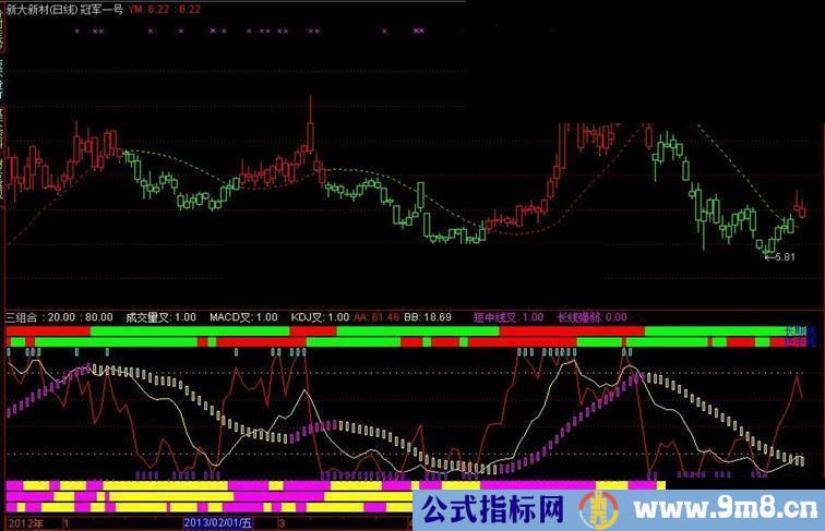 传统的MACD、KDJ、VOL三个指标,当底部三个指标都为紫色且中间的柱子变也变为紫色,可大胆介入并持有,反之,当底部三个指标都变为黄色或中间的柱子变也变为黄色则坚决离场