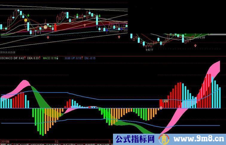 本指标采用艾略特osc震荡指标为基础,进行macd化,有面积底背离提示,macd红、蓝柱超过或低于两根蓝线也是重要提示