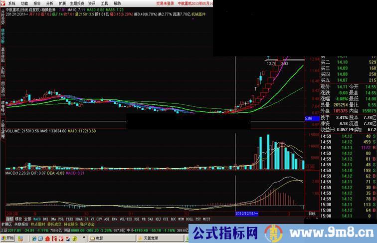 用法:当均线趋向多头排列,红方块逐渐变大时,若量能温和放大,且MACD即将上穿零轴或已经上穿零轴,即可买入;只要红方块没变蓝,就可继续持有,这样可以避免K线等其他指标的干 扰,骑的稳,拿得住。 当变为蓝方块,可考虑波段操作,卖出部分或全部筹码,若此时大盘向好,而个股均线系统还呈多头排列,也可继续持股,进行中长线操作,会有较大收益。
