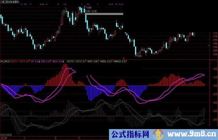 还有,你不要用纵坐标值看周线macd曲线的数值,本公式主要是为了在日线macd指标中同时观察周线MACD曲线的趋势。当然,如果你确想知道倒数第n条周K线上的周线MACD的具体数值,就把光标移到本图的第n条K线位置上,看顶行显示的后4个数据:该周日期(倒数第n周周末交易日的日期)WDate、WDif、WDea、和WMacd值。这些值是准确的、没有变换的周线macd值。