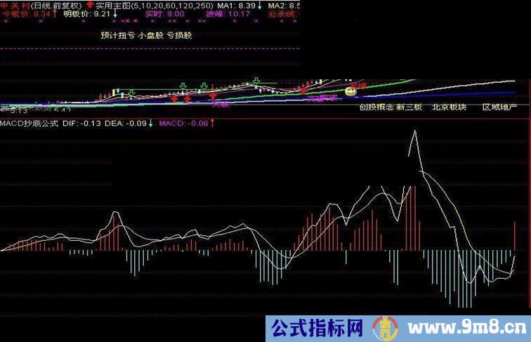 DRAWTEXT(M>30 AND DEA<-0.35 AND ABS(DEA/C)>0.035 AND DIF>REF(DIF,1),DEA,'超卖'),COLORMAGENTA;