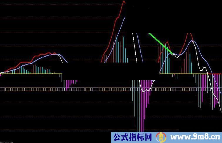 STICKLINE(((MACD>REF(MACD,1)) AND (MACD<0)),0,MACD,1,0),COLORFF00FF,LINETHICK2;