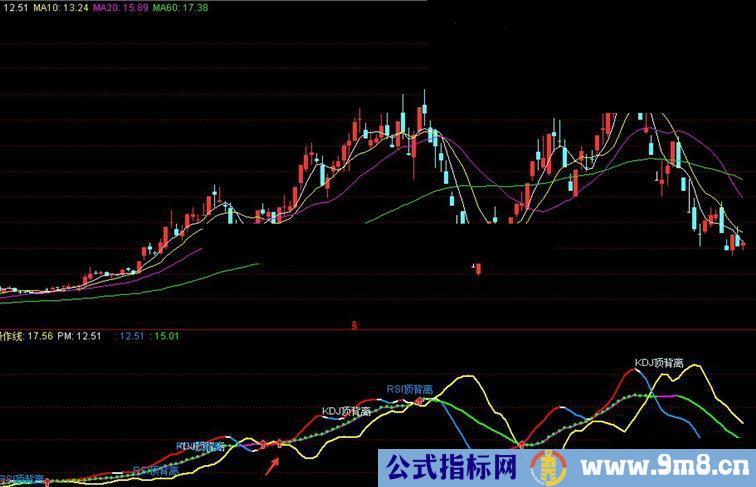 DRAWTEXT(D2> 0,H+0.08,'KDJ顶背离'),COLORFFFFCC;{KDJ顶背离}